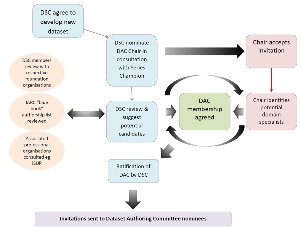 DAC’s are convened as needed for the development of specific datasets. They are composed of 8-12 domain specialists, comprising expert pathologists and clinicians. Domain specialists are selected for their expertise in the cancer field and their support of structured pathology reporting of cancer. Geographical and linguistic diversity is sought where possible.